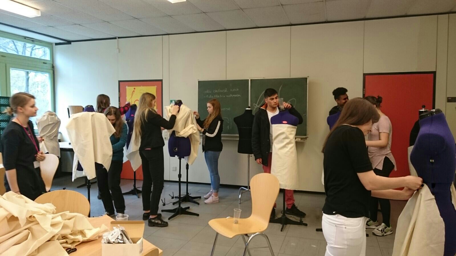 Bei der Drapierstation gestalteten die Schüler jeweils mindestens eine Schneiderpuppe passend zum Thema Falten.