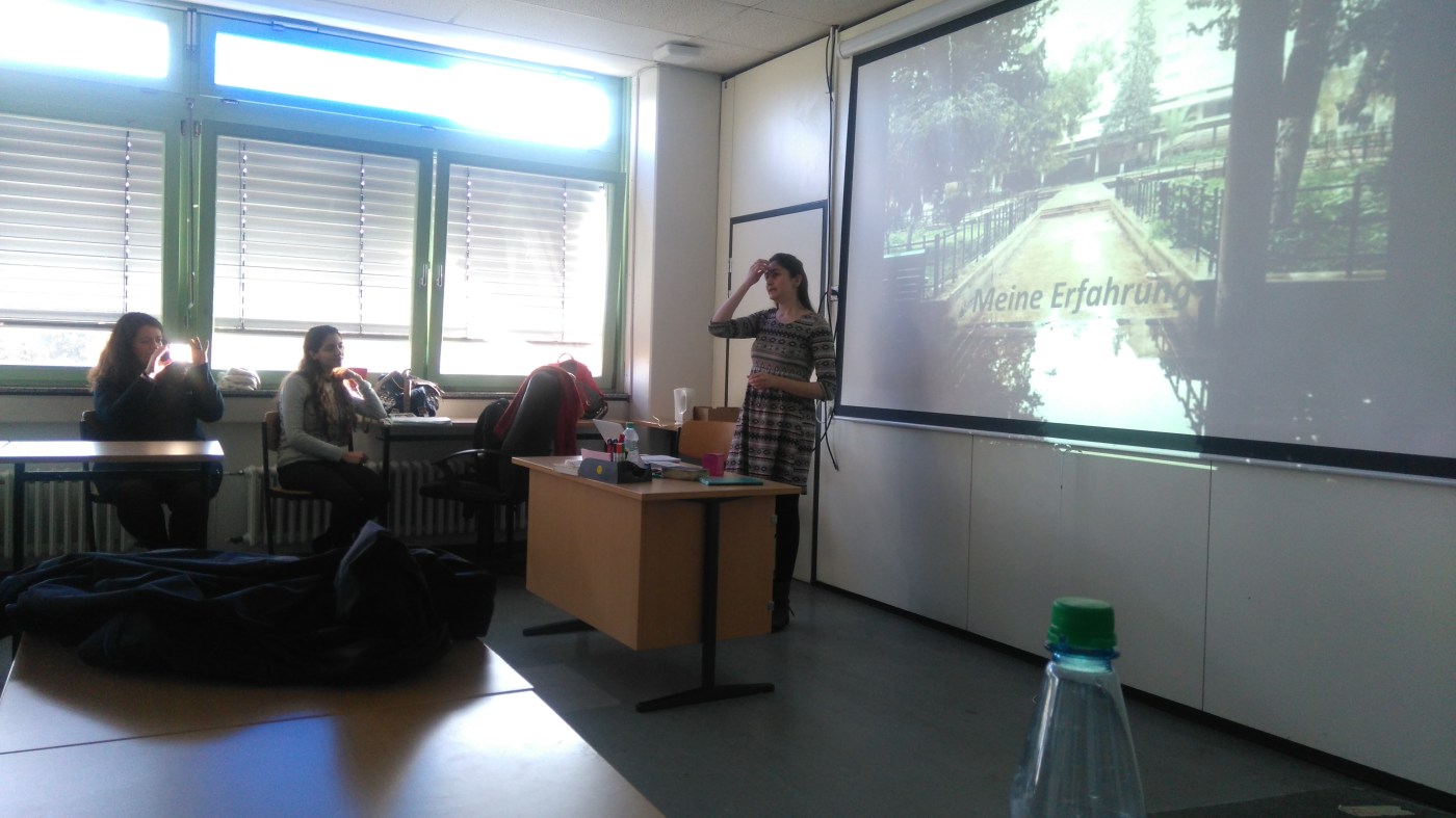 Rasha hat ein Spiel vorbereitet, bei dem kleine Zettel gezogen werden, auf denen Fragen stehen, die wir ihr stellen dürfen. Die Fragen drehen sich um Aleppo, ihre Heimatstadt. So beginnt eine Art Interview und sie erzählt lächelnd von gutem Essen, Traditionen, Sehenswürdigkeiten und davon, ob es in Aleppo eigentlich moderne Orte gibt. Wir erfahren, dass sie ihr Leben dort geliebt hat, ihre Wohnung, ihre Freunde, und dass sie Medizin studiert hat. Sie erzählt aber auch, was mit der Stadt im Zuge des Krieges passiert ist, zeigt uns Bilder von Häusern, vor und nach den Bombardierungen. Als der Krieg begonnen hat war sie 15, aber erst im Dezember letzten Jahres ist sie nach Deutschland geflüchtet. Zum Schluss dürfen wir ein Video mit Fotos von sich und ihren Freunden sehen, unterlegt mit einem deutschen Liebeslied. Die Bilder zeigen ganz normale Jugendliche, die Blödsinn und Selfies machen, lachen, Spaß haben – die nichts wissen von Flucht und Schmerzen. Durch die Erinnerungen steigen Rasha Tränen in die Augen und auch in meiner Klasse fangen einige bei dem berührenden Anblick an zu weinen.