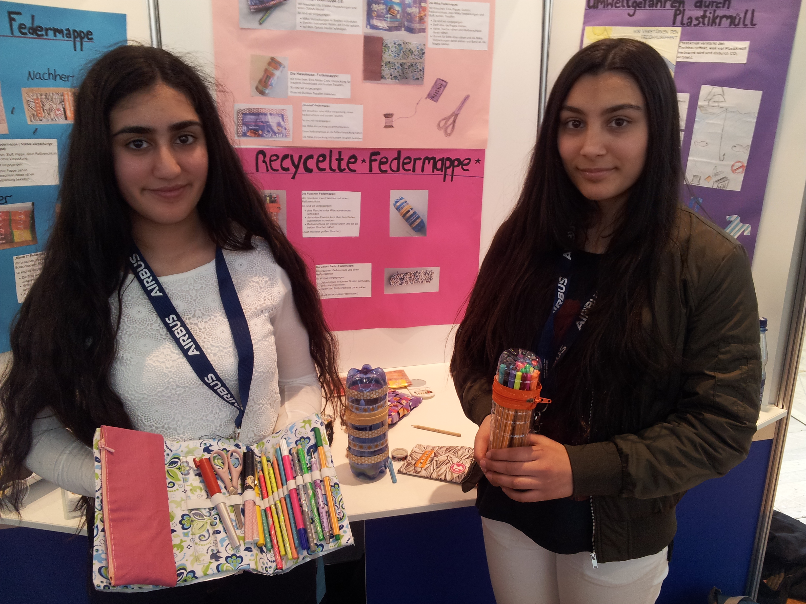 Viele der Themen hatten auch mit Umwelt zu tun und mit der Frage, was wir eigentlich tun können, um sie zu schützen. Da wurde dann auch schon Fischgülle als Energiequelle in Betracht gezogen, Müllfilteranlagen für Flüsse gebaut – oder eben recycelte Federmappen hergestellt. So, wie es Dilara Acar und Badem Bardosana aus unserer Schule gemacht haben, was sie mir erzählten, als ich endlich auch an ihrem Stand angelangt war.