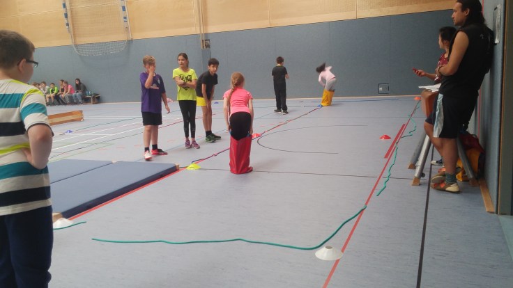 Auf dem Kunstrasenplatz und der Turnhalle haben die Jahrgänge 5-7 sich in verschiedenen Sportspielen in Teams gemessen. Strahlend blauer Himmel thronte über der Veranstaltung. Bei Farbenbingo, Hosenlauf, Sackhüpfen, Brainlauf und anderen Spielen, wurde auch der größte Sportmuffel motiviert. Jede Klasse hat sich in vier Teams gegeneinander gemessen. Alle hatten viel Spaß bei der Bewegung und der anschließenden Siegerehrung.