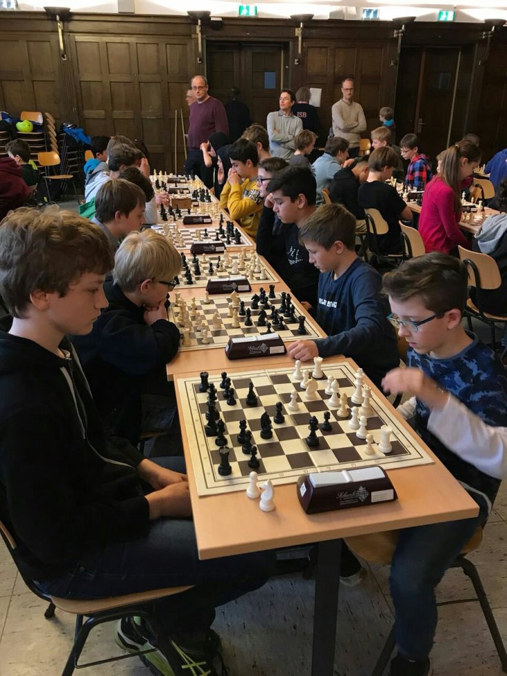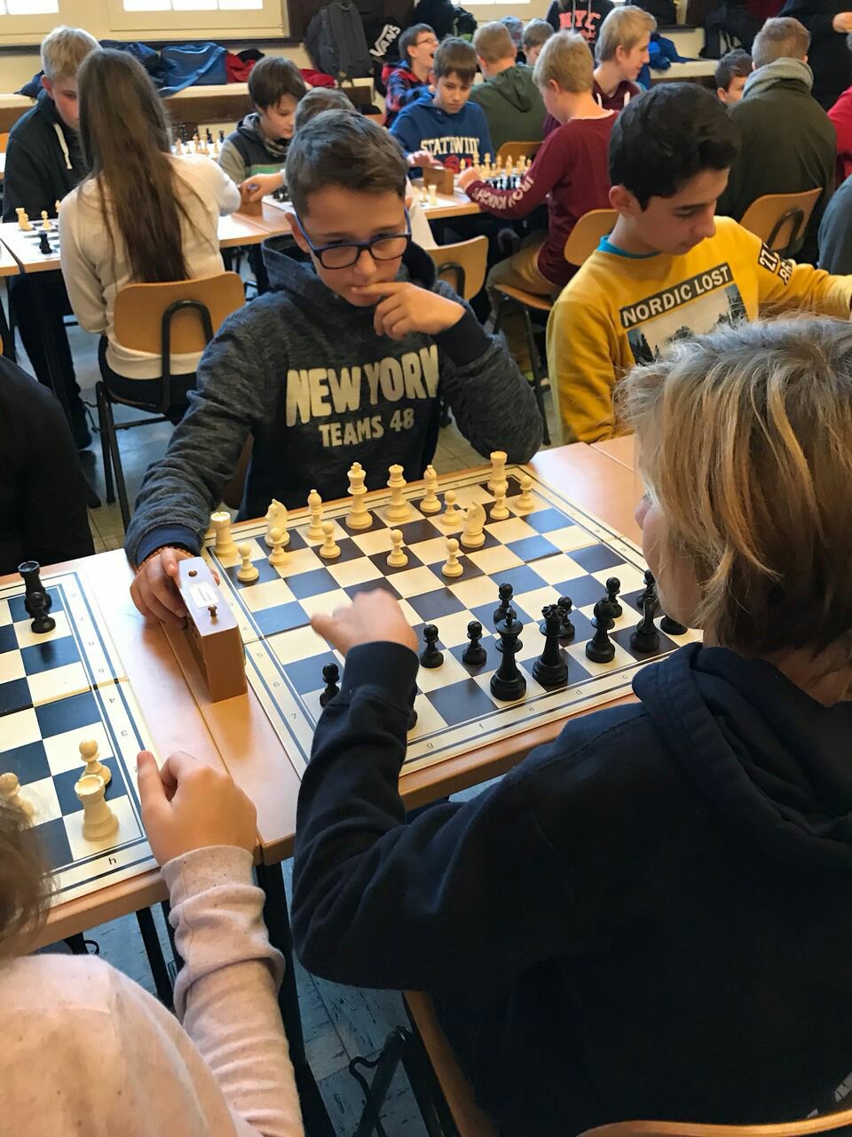 Als wir angekommen sind, haben wir uns überlegt welche Strategie wir benutzen. Wobei Herrn Papin uns geraten hat, nicht Schäfermatt zu benutzen. Danach sind wir in die Aula gegangen, wo 56 Schachbretter waren und 120 Menschen. Wir waren angespannt, aber haben auf das beste gehofft. Am Ende wurden wir 11. von 15 Mannschaften. Wir haben eine Urkunde und eine Dose Süßigkeiten bekommen.