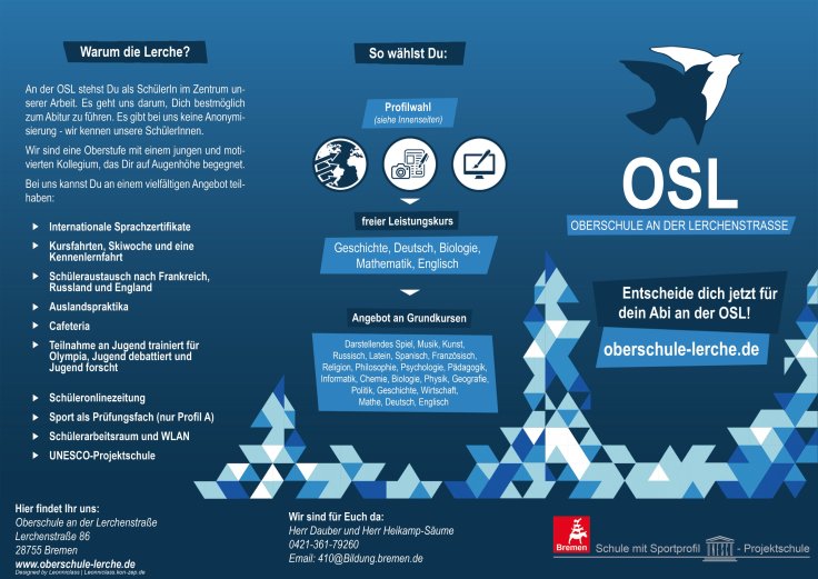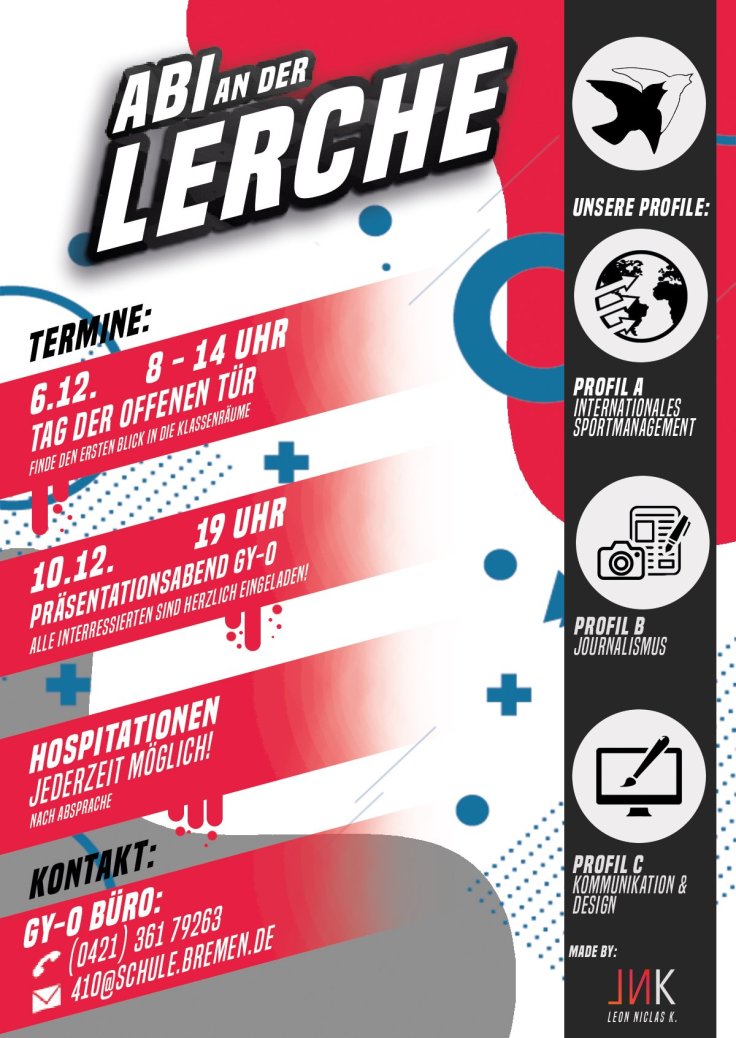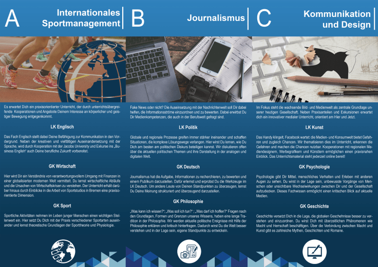 Im letzten Jahr konnten wir so viele Schüler*innen wie noch nie für unsere Oberstufe begeistern. Darüber freuen wir uns. Aber, wer sich auf den Lorbeeren ausruht, der trägt sie am falschen Ort. Also machen wir uns wieder mit Volldampf auf den Weg und präsentieren unsere Profile stolz dem nächsten Jahrgang. Auf den wirklich tollen Flyern und Info-Broschüren findet ihr die wichtigsten Termine und wie immer bieten wir Interessierten jederzeit Hospitationsmöglichkeiten an. Wir freuen uns auf Dich, komm‘ vorbei und bringe deine Freunde gleich mit!