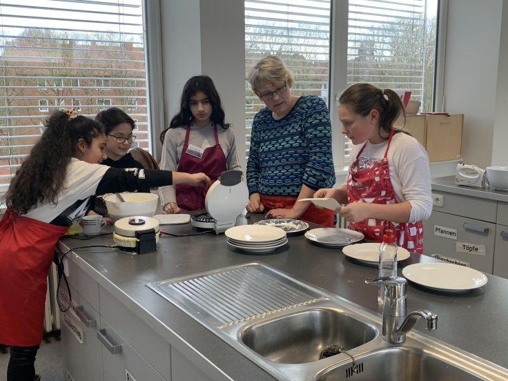 Wir als Schülerzeitung schauten uns zu erst die Schulführung von Herrn Minkenberg-Papin und Herrn Brunnecke an, welche im Naturwissenschaftlichen Raum begann. Im nächsten Schuljahr werden erstmal Französisch und Russisch in der Schule angeboten, über weitere Sprachen wird noch diskutiert. Dann ging die Führung in den Mathe-Raum, wo die Kinder Würfel zusammen puzzeln sollten. Im Kunst Raum durften die Kinder Notizhefte basteln und gestalten. Im Gebäude gibt es auch noch eine Küche, wo die Kinder die Chance hatten, Waffeln zu backen.