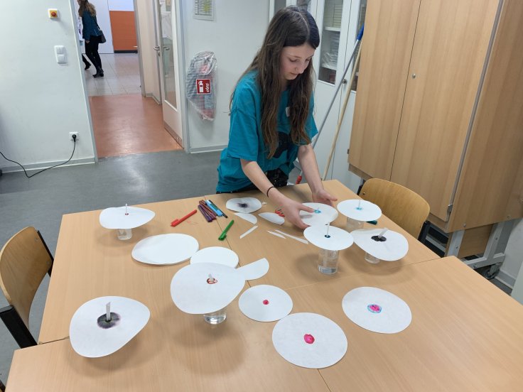 Ein Stockwerk tiefer befand sich der Englisch Raum, wo die Kinder Englisch-Vokabeln zu Bildern zu ordnen konnten. Nicht nur in der Küche konnte man kochen, sondern auch im Russisch-Raum. Dort gab es „Pelmeni“, welches die Kinder selbst zubereiten und auch kosten durften. Wollte man mehr über die naturwissenschaftliche Seite der Schule erfahren, so baute man Schaltkreise auf, nahm Geschmacksproben und erstellte einen Farbverlauf auf Filterpapier (Chromatographie).