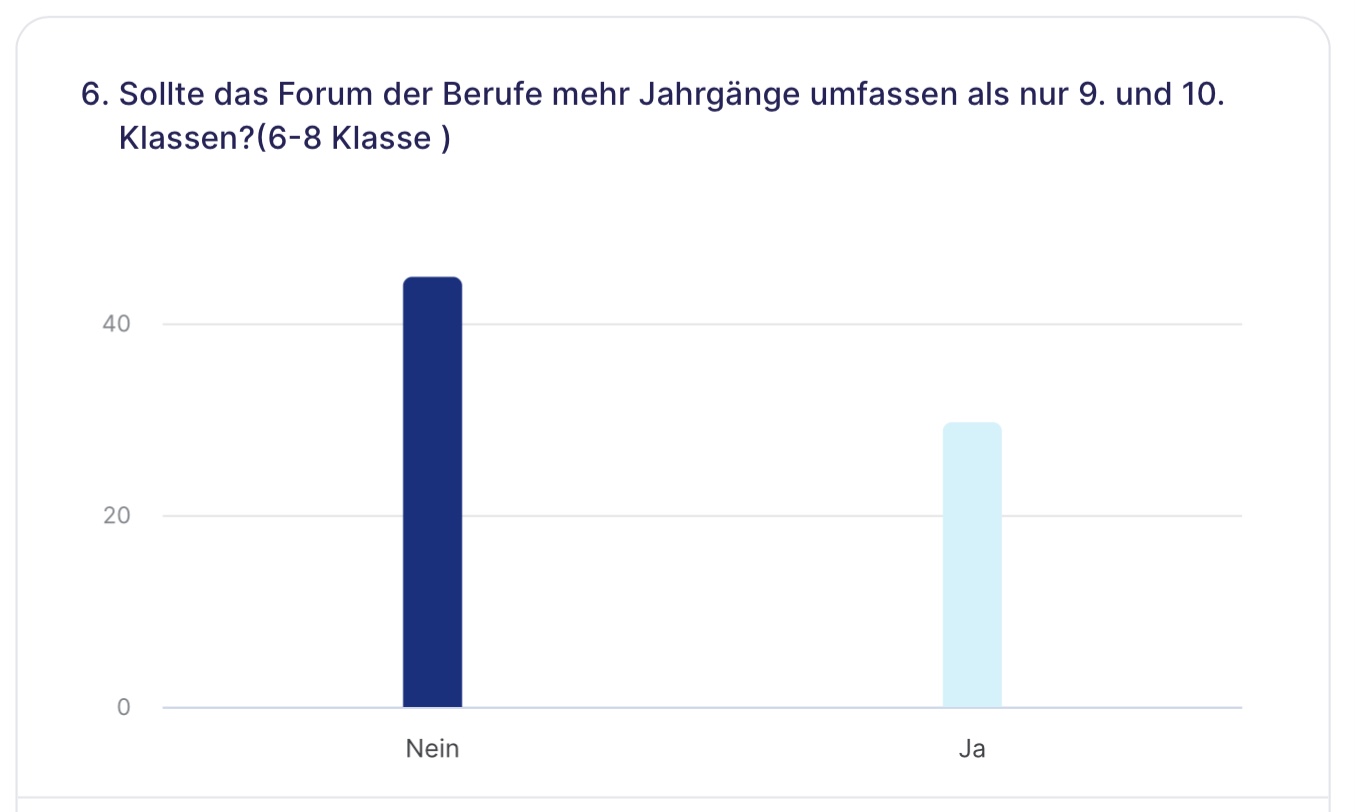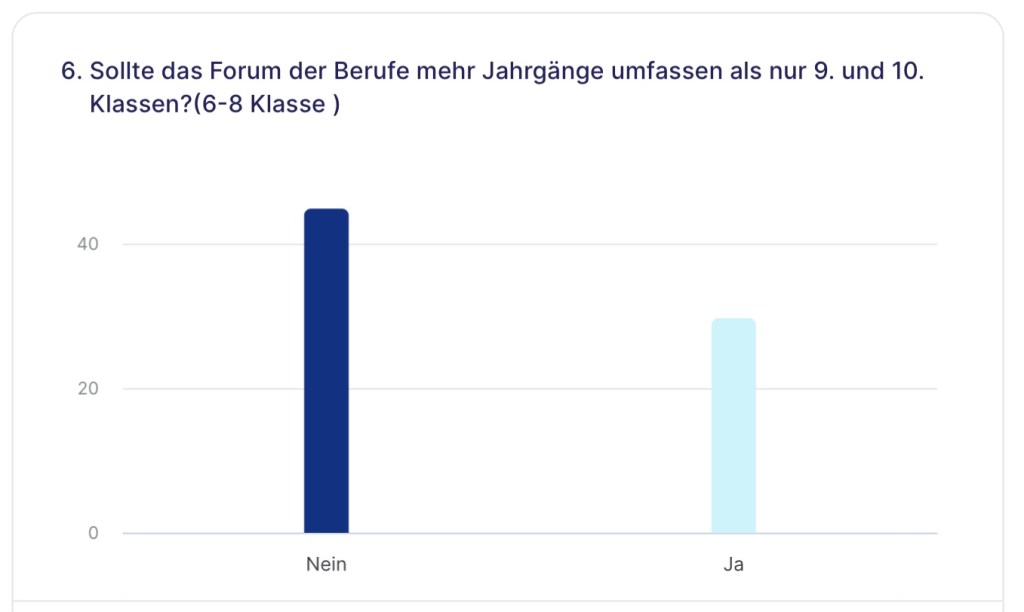 Um die Bedeutung und den Erfolg des Forums der Berufe besser zu verstehen, habe ich eine Umfrage unter den teilnehmenden Schülern durchgeführt. Hier sind einige der wichtigsten Ergebnisse: Etwa 60 von 70 der befragten Teilnehmer finden, dass das Forum der Berufe nützlich ist, um Kontakt mit anderen Firmen und Unis zu schließen. Außerdem war die Frage ,,Sollte das Forum der Berufe mehr Jahrgänge umfassen als nur 9. und 10. Klassen?( 6-8 Klasse)“, sehr umstritten. Denn nur 30 Teilnehmer der Befragten waren dafür und die restlichen 40 der Befragten dagegen. Dieser Aspekt ist eigentlich positiv. Dies hat den Vorteil, dass die Schüler zu diesem Zeitpunkt bereits über grundlegende schulische Kenntnisse und eine gewisse Reife verfügen, um die Informationen und Einblicke, die sie während des Forums erhalten, besser zu verarbeiten.