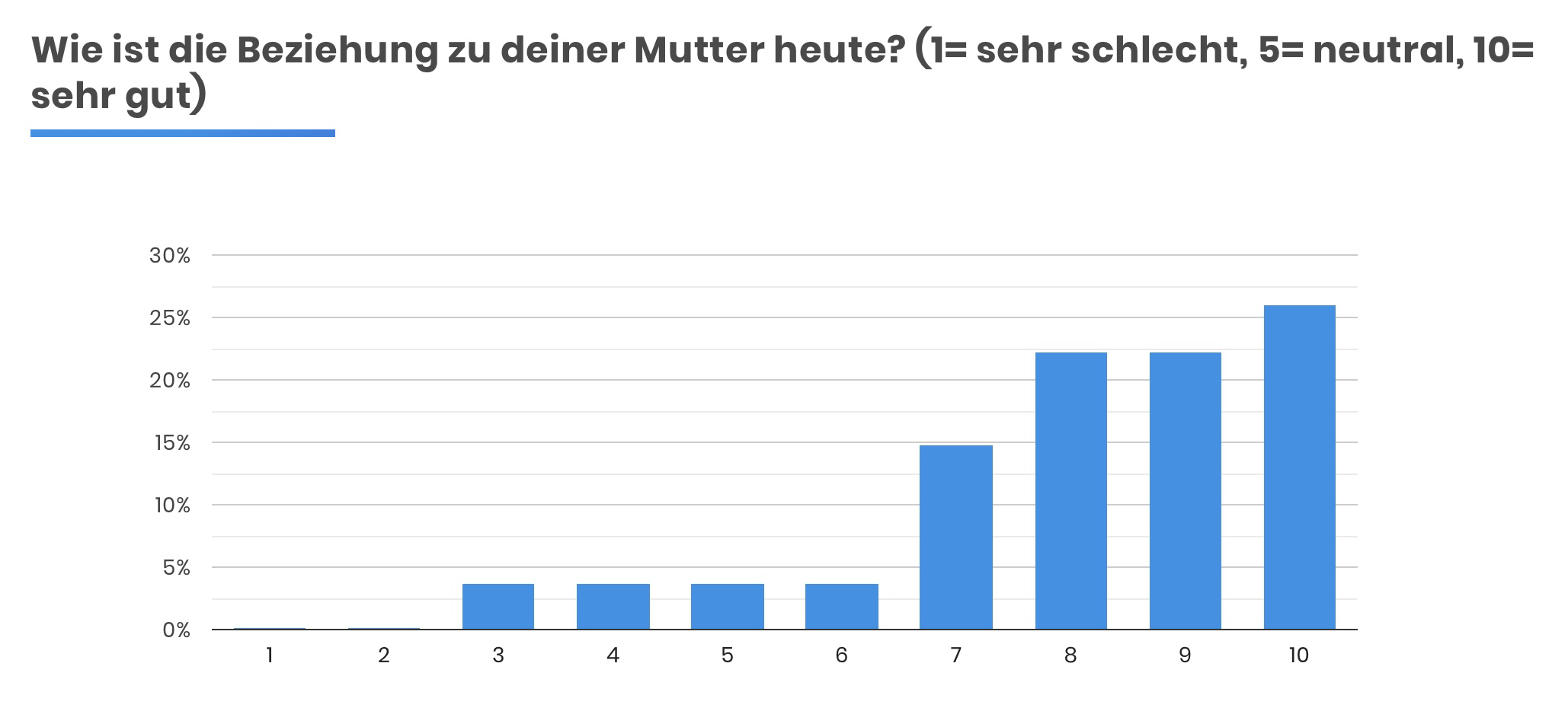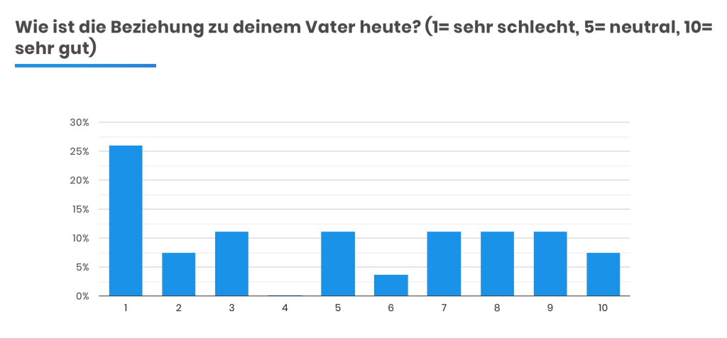 Die Beziehung zur Mutter stellte sich, mit einem Anteil von 25%, als „sehr gut“ bis neutral heraus, während die Beziehung zum Vater zu 29% als „sehr schlecht“ beurteilt wurde. Der Rest der Angaben, im neutralen und positiven Bereich, fällt eher durchmischt aus. Der Vater ist demnach für die Befragten weniger als Bezugs- und Vertrauensperson zu kategorisieren, als die Mutter.
