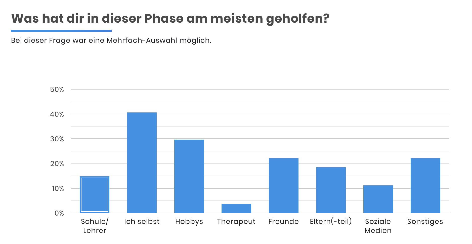 In dieser Phase geholfen habe den Schülern am meisten sie selbst (39%) und ihre Hobbys (29%). Zudem halfen 14% der Schüler die Schule und die Lehrkräfte. Auch Elternteile (18%) waren in der Zeit wichtig, genauso wie Freunde (21%).