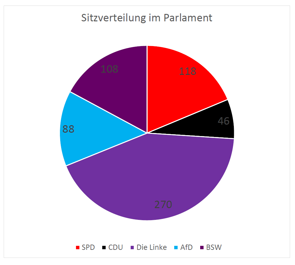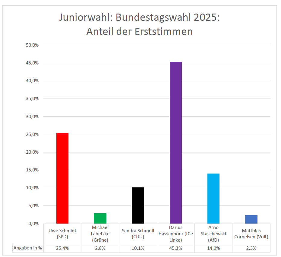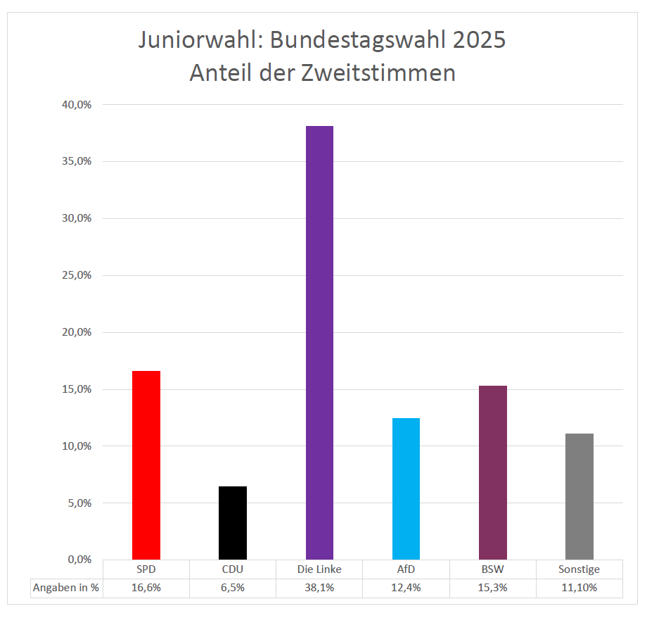 Die Jahrgänge 9 und 10 und die Oberstufe haben bei einer Wahlbeteiligung von 79,4 % ein klares Votum abgegeben. Die Linke ist der eindeutige Wahlsieger, die FDP (2,6 %) und die Grünen (3,4 %) verpassen den Einzug in das Parlament.