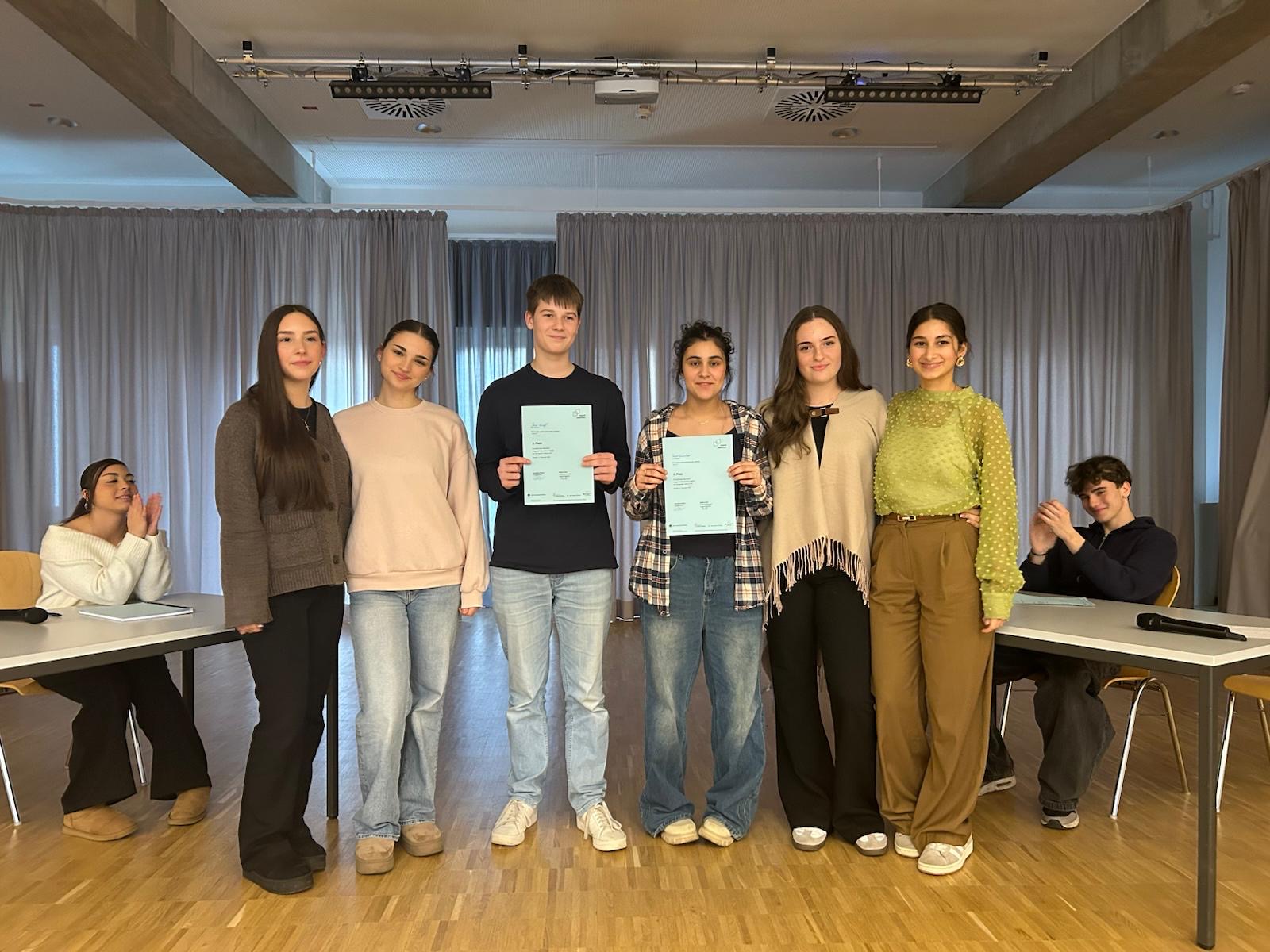In den Debatten der Sek. II waren die Themen: „Sollte die in Deutschland geltende Buchpreisbindung abgeschafft werden?“ und „Sollte Deutschland die Anwendung der Gentechnik-Methode CRISPR/Cas in der Humanmedizin erleichtern?“. Hier haben die Schülerinnen Sophie Rutke (24B), Luna Frankenberg (24B), Liv Jessop (24A2) und Tatjana Siegfried (24C) gewonnen. Die Finalfrage ist „Sollte sich die aktuelle Bundesregierung für ein Verbotsverfahren gegen die AfD einsetzen?“. Diese Frage wurde besonders intensiv debattiert.