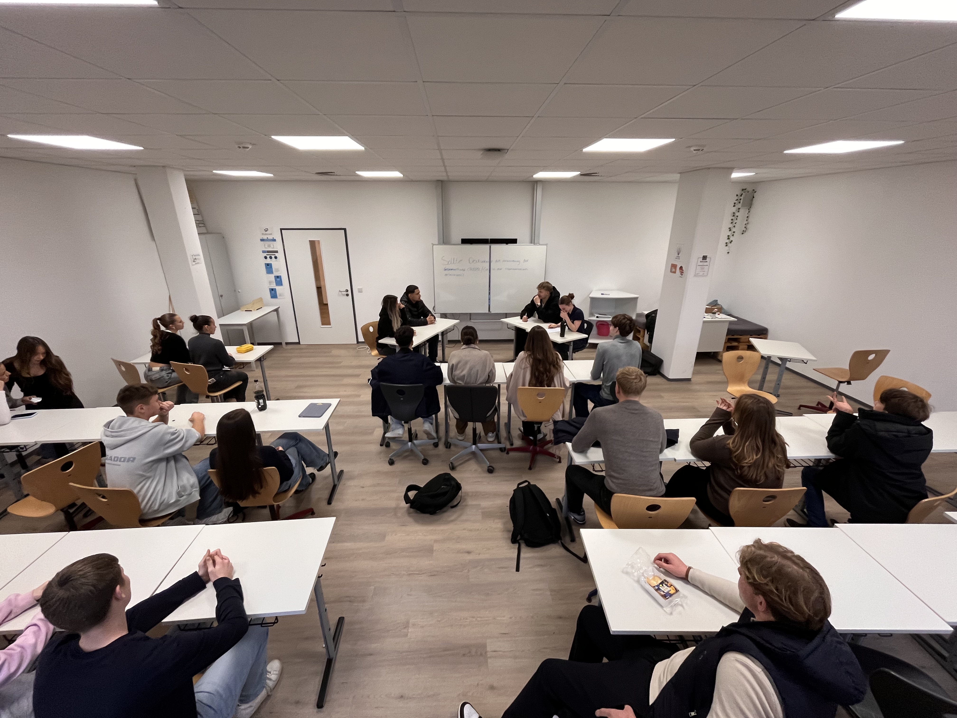 Es ist der 11.12.2025 und wir betreten den Flur, unseres Oberstufen Gebäudes. Mit einem kräftigen Zug, öffnen wir die Eingangstür. Vor uns steht eine große Menschenmenge, der unterschiedlichsten Jahrgänge. Von der 9. bis zu der Q2 ist alles dabei. Die allgemeine Stimmung ist angespannt und konzentriert. Sie stehen in Gruppen oder alleine und bereiten sich darauf vor, in ihrer Debatte mit schlagfertigen Argumenten zu überzeugen. Das 25B Team rennt durch die Gegend und kümmert sich um den Aufbau und die Verteilung der Schüler auf die verschiedenen Räume.